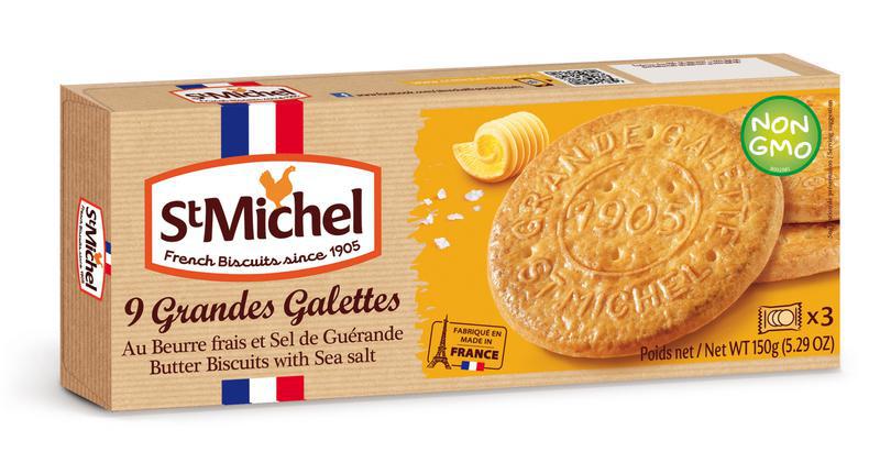 St Michel Grandes Galettes with Butter & Sea Salt are crisp butter cookie rounds that are stamped with the mark of St Michel Biscuiterie. Each galette, sprinkled with sea salt from Guérande, is ultra buttery with salty accent. 9 cookies per package. Baked with non-GMO ingredients and free-range eggs. No preservatives, palm oil, hydrogenated oil or colorings 150g